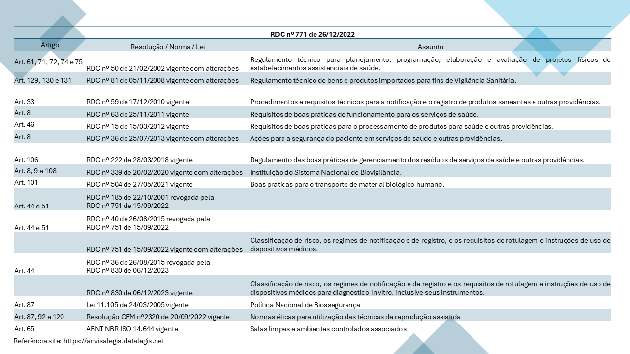 Pensando na necessidade dos profissionais envolvidos na gestão da qualidade em atualizar seus conhecimentos sobre o conjunto regulatório vigente, a Bioinvolve disponibiliza um compilado sobre as normas e regulamentos técnicos citados na RDC nº 771 de 26 dezembro de 2022 contendo as respectivas atualizações e indica o Guia de Boas Práticas em Células e Tecidos humanos para uso terapêutico- Guia nº 73/2024, versão 2, de 03/04/2025 disponível no site da ANVISA.
