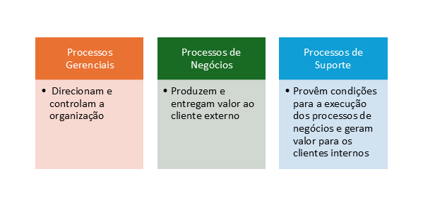 O entendimento sobre processos proporciona uma visão sistêmica pois permite a visualização dos subprocessos, atividades e tarefas que os compõem e as interfaces entre as diversas áreas ou departamentos da organização. Internamente às organizações, os processos se subdividem em diferentes tipos: processos gerenciais, processos de negócios e processos de suporte.